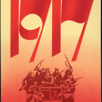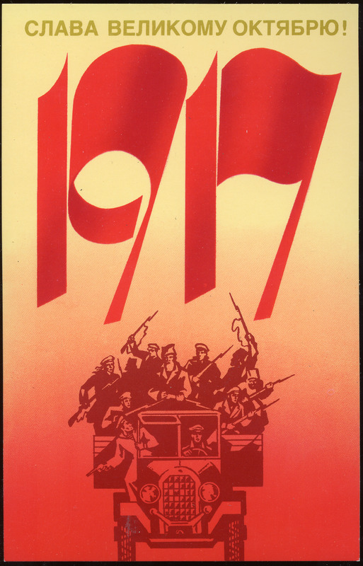 - This postcard is red, orange and yellow with a Russian phrase, СИАВА ВЕИИКОМУ ОКТЯБРЮ! at the very top. "1917" in large, red print is beneath the phrase; an illustration of soldiers in a truck is at the bottom. On reverse:Художник А. Июбезнов©[copyright] «Плакат». Москва. 1989 r.Изд. No 10162592. 3. 9-9097. T. 1 350 000 экз. Ц. 3 коп Тип. изд-ва «Зоря».ОТПРАВЛЯТЬ ПО ПОЧТЕ ТОЛЬКО В КОНВЕРТЕ