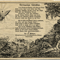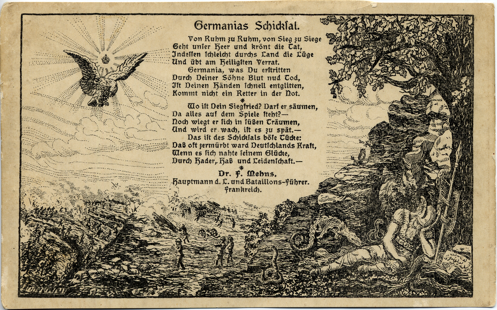 This postcard is a black and white drawing of a battefield. In the top left corner is a large bird and in the bottom right corner is a warrior with his head in his hand. Beside him are snakes and other reptiles. In the middle of the postcard is a set of verses entitled "Germania Schicksal." Text at bottom of verses: "Dr. F. Mehns. Hauptmann d. L. und Bataillons-Führer. Frankreich." On reverse: "'Vita-Venus' von Dr. F. Mehns. Xenien-Verlag, Leipzig./Beste Schützengraben-Lektüre."; "Lithogr. Anst.-Druckerei G. Mechling u. Sohn, Metz, Coislinstraße 16."