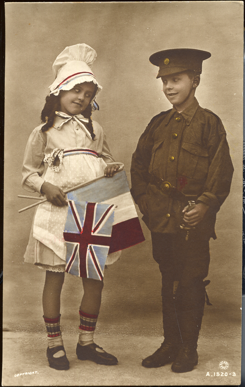 - This is a hand-painted, sepia-toned photo of a girl holding two flags and a boy in a soldier's uniform. Text at bottom left: "Copyright". Text at bottom right: "Rotary Photo A.1520-3". On reverse: "Printed in Britain"; "This is a hand-painted real photograph of British children."; "Rotary Photo, London, E.C.".