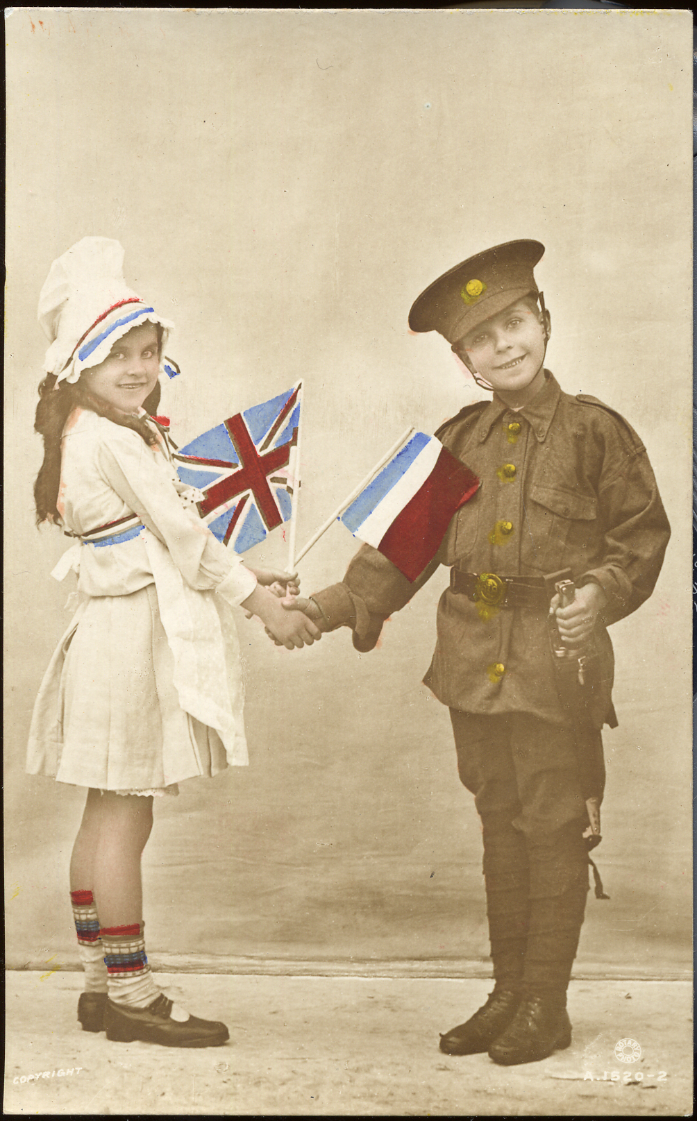 - This is a hand-painted, sepia-toned photo of a girl holding two flags and shaking hands with a boy in a soldier's uniform. Text at bottom left: "Copyright". Text at bottom right: "Rotary Photo A.1520-2". On reverse: "Printed in Britain"; "This is a hand-painted real photograph of British children."; "Rotary Photo, London, E.C.".