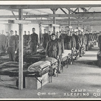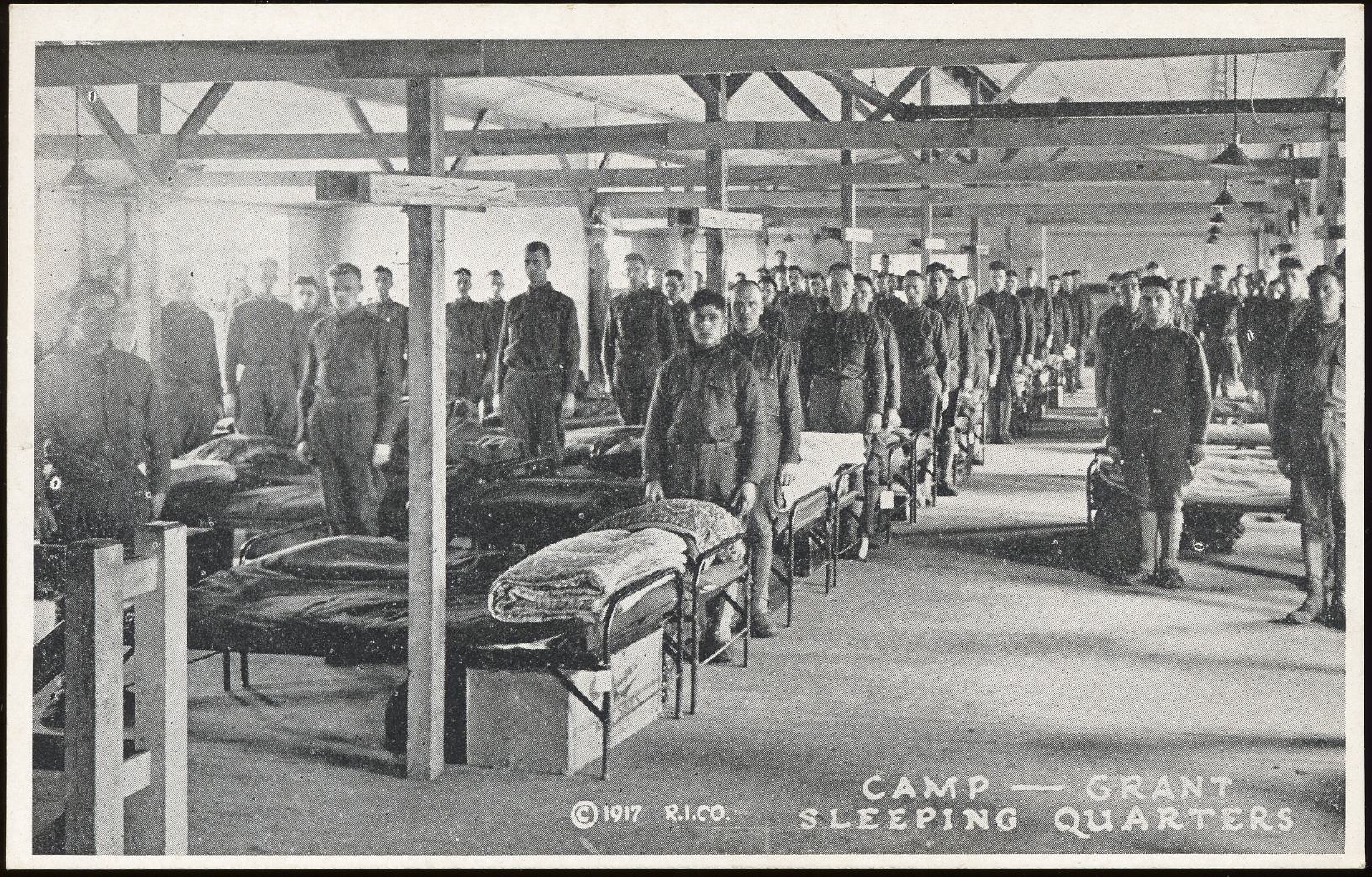 - This postcard is a black and white photo of soldiers standing by their beds in the barracks. Text at bottom right: "© 1917 R.I.CO. Camp -- Grant Sleeping Quarters". On reverse: "Published by the Photo-Post Card Co., Rockford, Ill."
