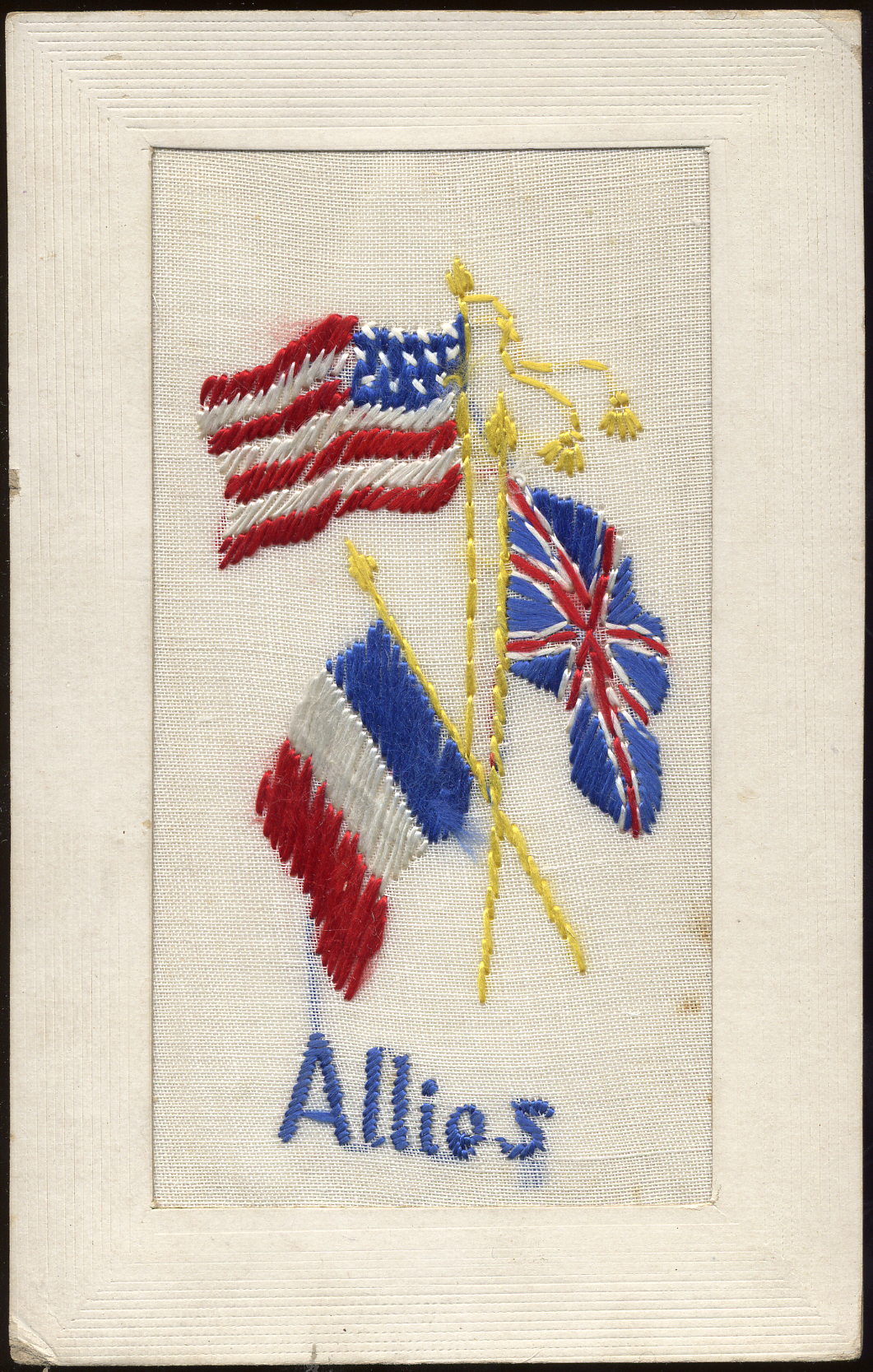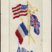 This postcard has three flags embroidered on the front and "Allies" embroidered beneath them. On reverse: "Switzerland"; handwritten message, contains date, 4/28/18.