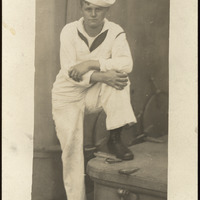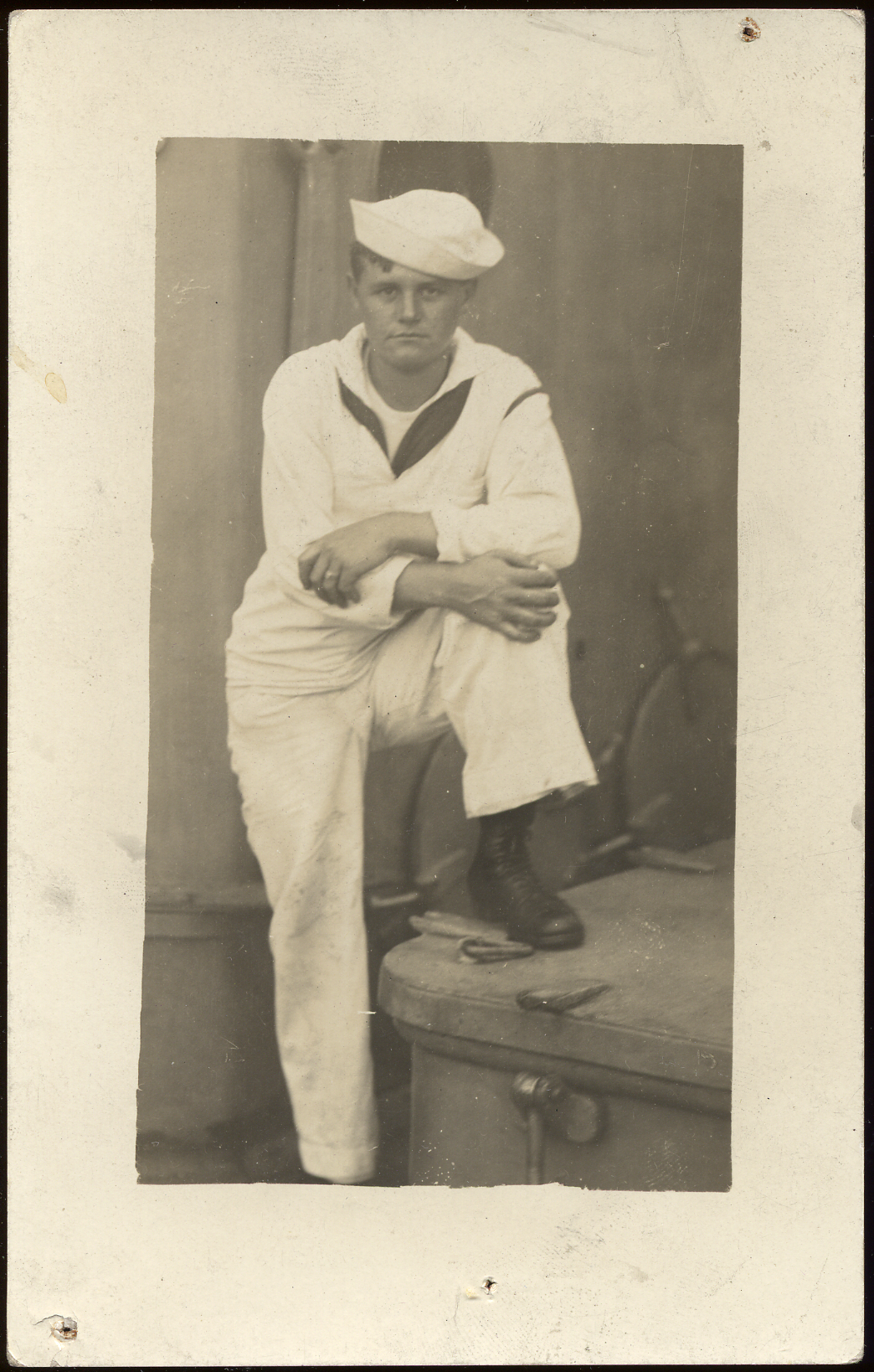 This postcard is a black and white photo of a sailor in white, standing with one leg propped up and leaning on his knee. On reverse: blank.