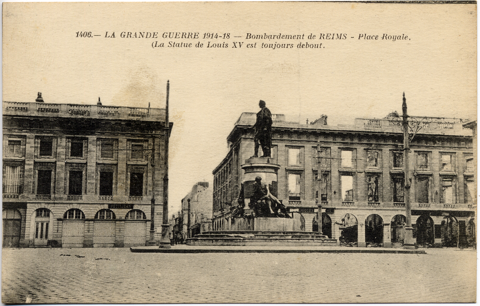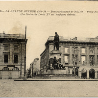 - This postcard is a black and white photo of a statue outside Place Royale of Louis XV. Text at top center: "1406.--La Grande Guerre 1914-18 -- Bombardement de REIMS - Place Royale,/(La Statue de Louis XV est toujours debout." On reverse: "Phototypie Paris Baudinière".