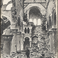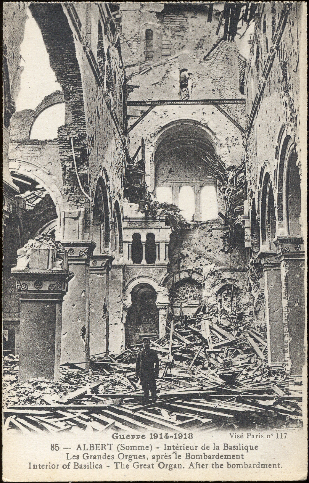 This postcard is a black and white photo of the ruins inside a basilica. A soldier stands in the foreground on a pile of broken beams. Text at bottom center: "Guerre 1914-1918 Visé Paris no 117/85--Albert (Somme) - Intérieur de la Basilique/Les Grandes Orgues, après le Bombardement/Interior of Basilica - The Great Organ. After the bombardment." Text alongside right edge: "G. Lelong, 21, Rue St-Martin, Amiens". On reverse: "Imp. Catala Frères, Paris."