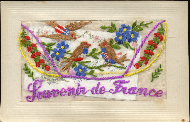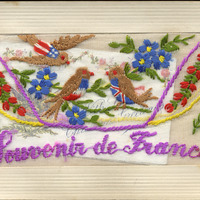 - This postcard has embroidered birds and flowers on the top and "Souvenir de France" embroidered on the bottom. The front of the postcard also functions as an envelope with three small cards on the inside. Each card has a picture of flowers and flags and the words "With Loving Christmas Greetings" on it. On reverse: "Fabrication française, visé Paris".