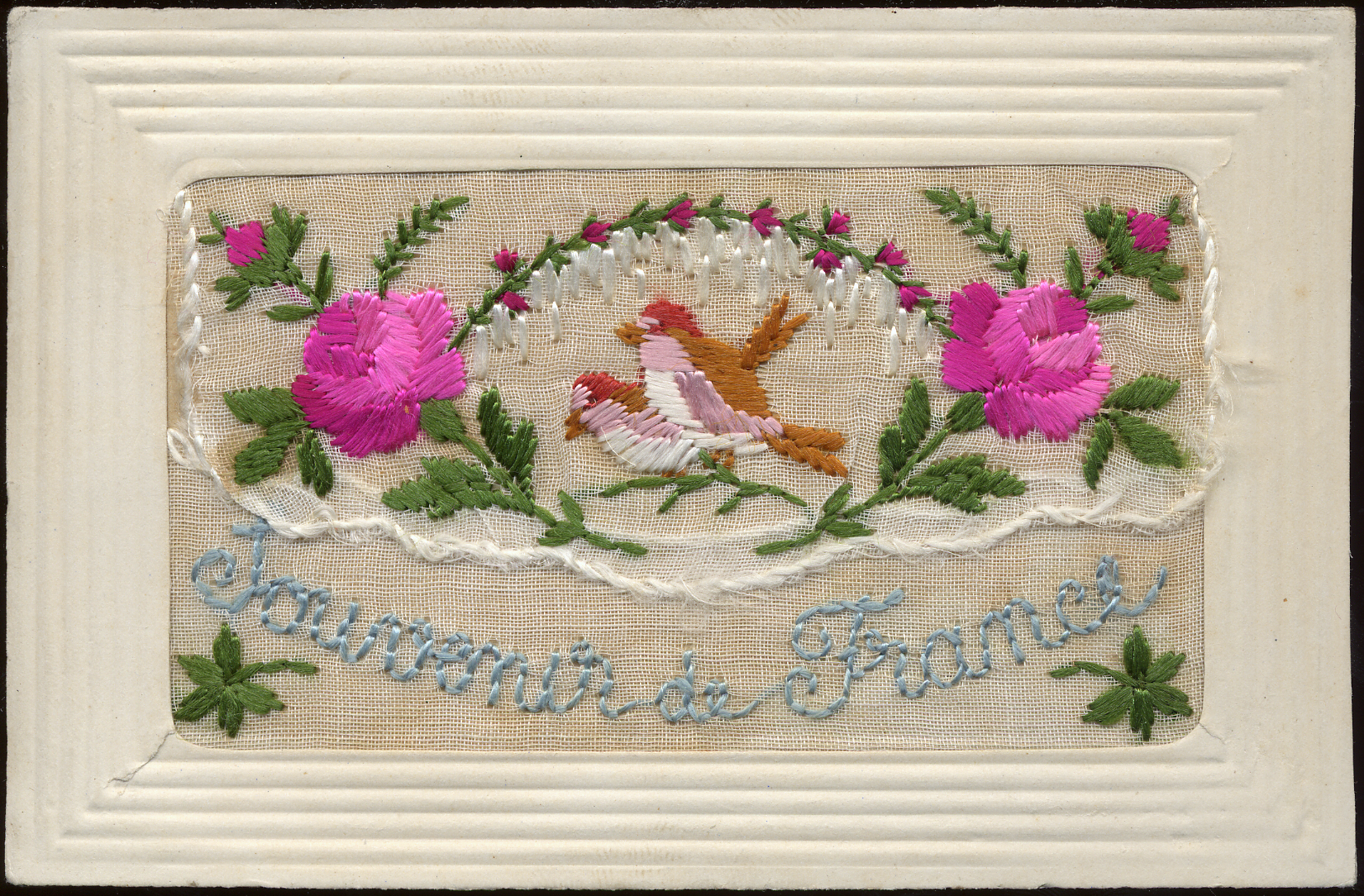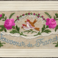 - This postcard has embroidered birds and flowers on the top and "Souvenir de France" embroidered on the bottom. The front of the postcard also functions as an envelope, but has nothing inside. On reverse: "Tous les pays étrangers n'acceptent pas la correspondance au recto, se renseigner à la poste"; handwritten message.