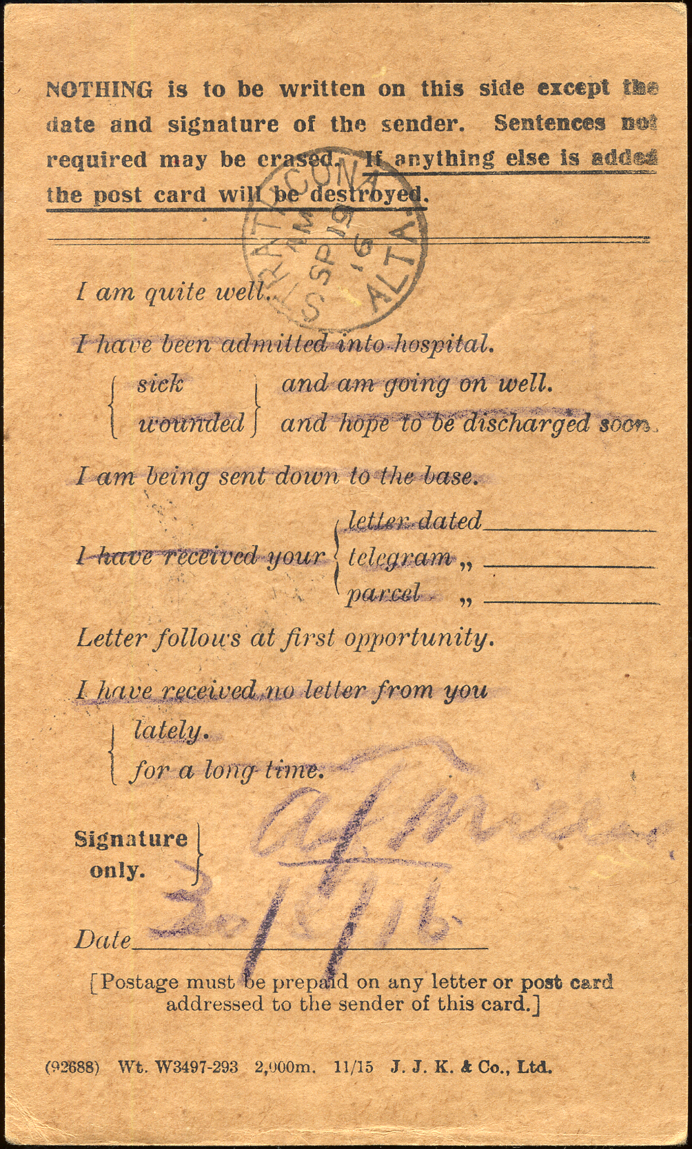 This postcard is a brown field service card with all lines scratched out except "I am quite well" and "Letter follows at first opportunity." Text at top center: "Nothing is to be written on this side except the date and signature of the sender. Sentences not required may be erased. If anything else is added the post card will be destroyed." Text at bottom center: "(92688) Wt. W3497-293 2,000m. 11/15 J.J.K. & Co., Ltd." On reverse: "A.F.A. 2042. 114/Gen. No./5248."; handwritten address.