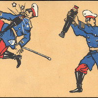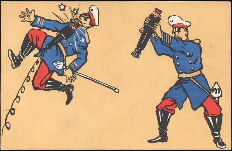 This postcard is a color illustration of two Asian soldiers in red, white and blue uniforms bouncing toy soldiers. On reverse: blank.
