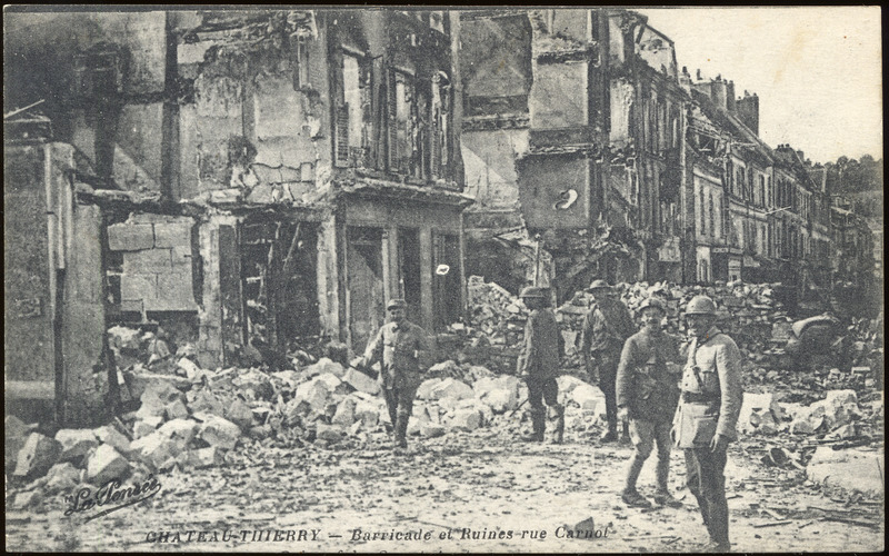 - This postcard is a black and white photo of ruined houses and ruins in the street. Five soldiers are walking through the ruins. Text at bottom center: "Chateau-Thierry -- Barricade et Ruines rue Carnot". Text at bottom right: "'La Pensée'". On reverse: blank.