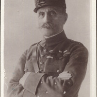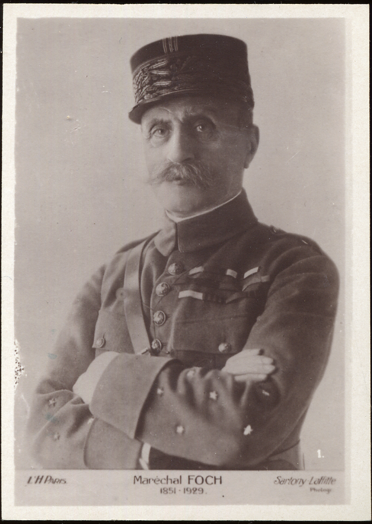This postcard is the first in a set of ten miniature postcards from Paris labeled "Souvenir De L'Armistice". It is a black and white photo of an old soldier. Text at bottom: "L'H Paris Maréchal FOCH 1851-1929 Sartony Laffitte Photograph". In the bottom right corner of the picture is a "1". On the outside of the enclosing envelope is "1. -- Maréchal Foch." On reverse: blank.