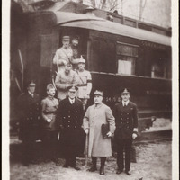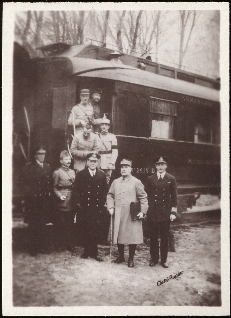 This postcard is the second in a set of ten miniature postcards from Paris labeled "Souvenir De L'Armistice". It is a black and white photo of soldiers outside of a train. Text at bottom right: "Cliché Pupier". In the bottom right corner of the picture is a "2". On the outside of the enclosing envelope is "2. -- Le Wagon. Descente des Alliés après la signature." On reverse: blank.