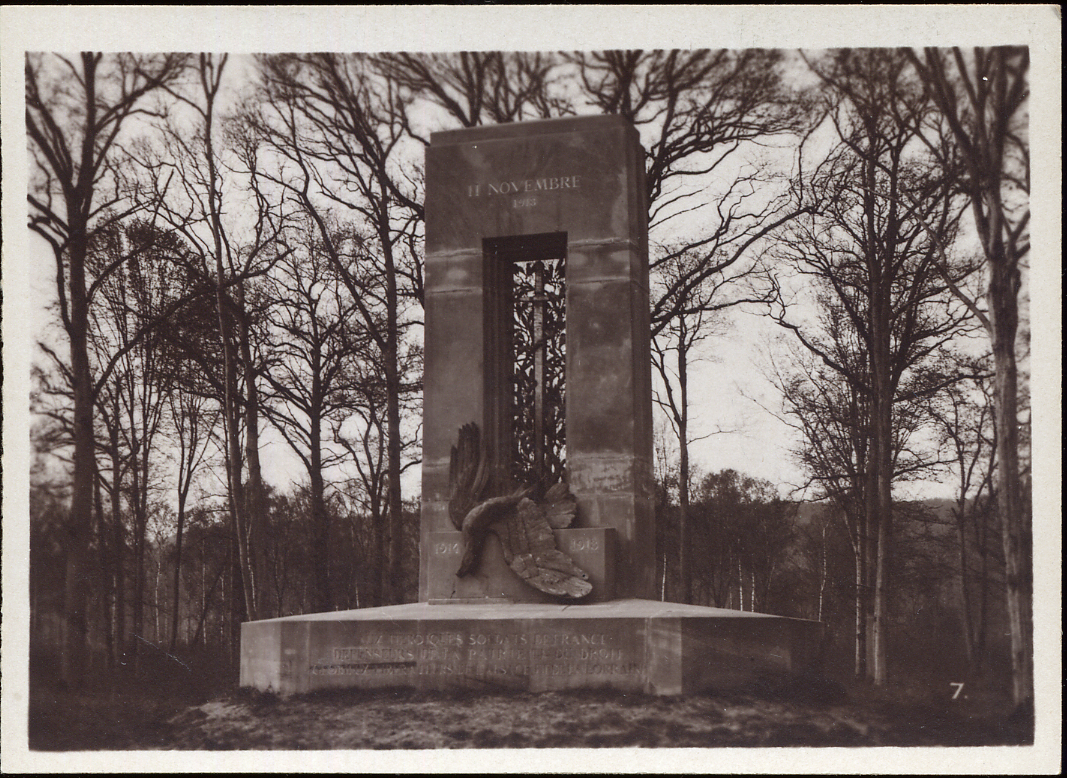 - This postcard is the seventh in a set of ten miniature postcards from Paris labeled "Souvenir De L'Armistice". It is a black and white photo of a large stone monument. In the bottom right corner of the picture is a "7". On the outside of the enclosing envelope is "7. -- Le Monument du «Matin»." On reverse: blank.