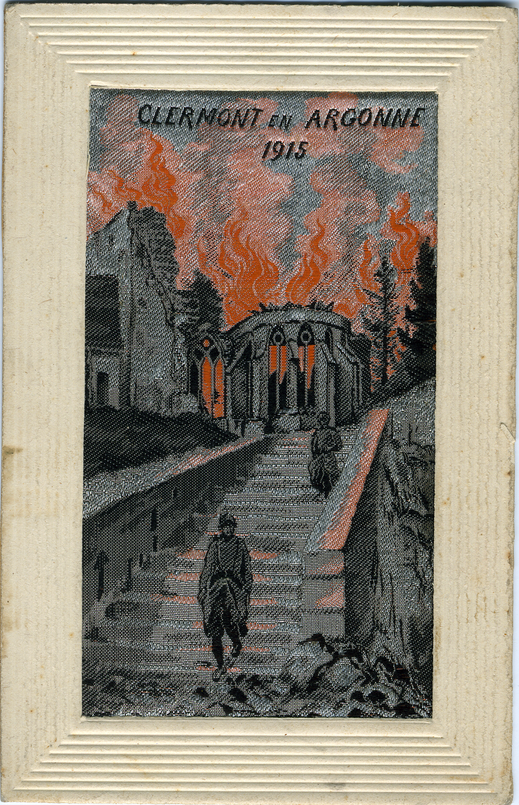 This is a card with an insert woven in silk and framed as a postcard. The scene is from Clermont in the Argonne, 1915.