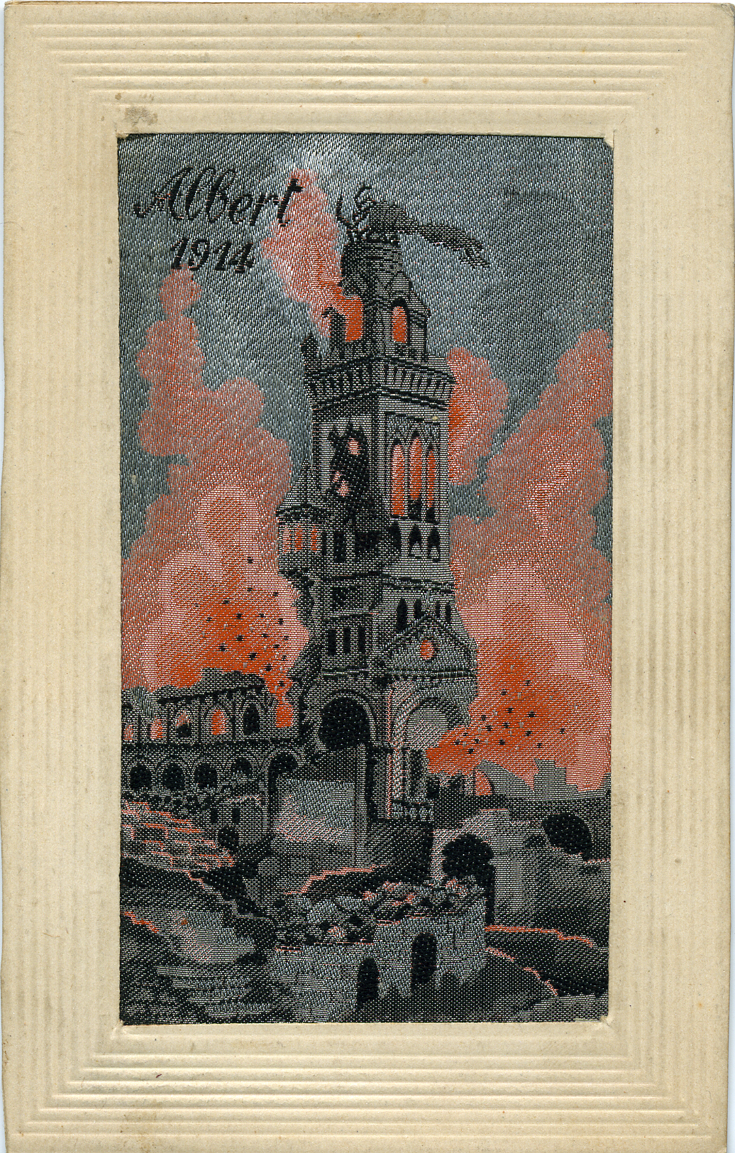 This is a card with an insert woven in silk and framed as a postcard. The scene is the basilica in Albert (1914) with the virgin holding the Christ child at the top of the steeple. The soldiers said that when it finally fell the war would end. Of course, taking shots at the statue was an interesting pastime for the fighting men. Other accounts said that it was purposefully pulled over so that it did not give the Germans a target with which to calibrate their big guns. Paul Fussell gives a full account of the “Golden Virgin” in The Great War and Modern Memory (131-35).