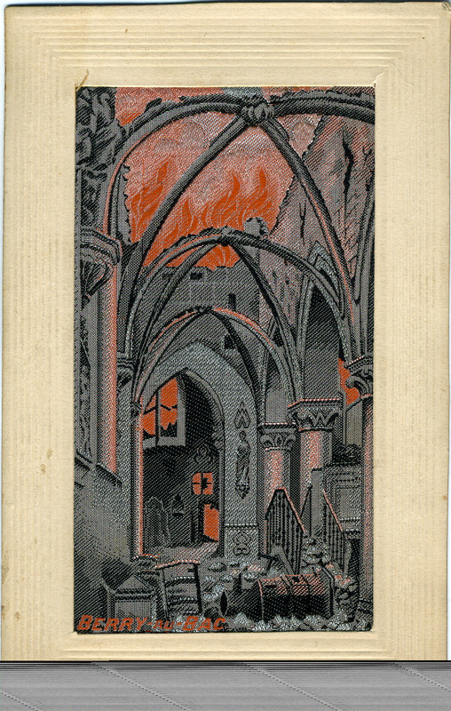 This is a card with an insert woven in silk and framed as a postcard. The scene is the devastated church at Berry au Bac.