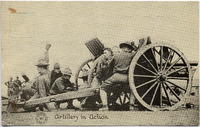 Artillery in Action This postcard is a black and white photo of soldiers behind a cannon. Text at bottom: "Artillery in Action". On reverse: "The Chicago Daily News/G.J. Kavanaugh/War Postal Card Department".