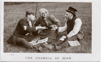 The Council of War This postcard is a black and white photo of three men sitting in the grass. The man in the middle is dressed as a woman, and each man has a sign by him reading "Dumb," "Deaf," and "Blind," respectively. Text centered at bottom: "The Council of War". On reverse: "Rotary Photographic Series".
