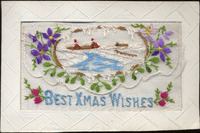 Best Xmas Wishes This postcard has embroidered flowers, three cabins embroidered on the top and "Best Xmas Wishes" embroidered on the bottom. The front of the postcard also functions as an envelope, but has nothing inside. On reverse: "fabrication française"; handwritten message.