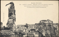 Guerre 1914-1918 This postcard is a black and white photo of the ruins of the Notre Dame Basilica. Text at top right: "Guerre 1914-1918/80 -- Albert (Somme) - Basilique de N.-D. de Brebières (côté Est)/Après plusieurs bombardements par les Allemands./The Basilica after several bombardments." Text alongside left edge: "Visé Paris no 113". On reverse: "Imp. Catala Frères, Paris."