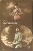 Gloria This postcard is a color-tinted, sepia-toned picture of a soldier with a bouquet looking up at a woman holding a bouquet. Text in middle left: "Vous avez pris ma fleur d'amour!/Gardez-là jusqu'à mon retour!" In bottom left: "380". Text in bottom right: "Gloria". On reverse: "Fabrication Française".