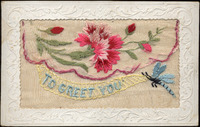 To Greet You This postcard has an embossed frame and pocket on the front. The flap of the pocket has an embroidered flower. Underneath the flap, the text "To Greet You" is embroidered next to a dragonfly. On reverse: "Printed in England"; handwritten message.