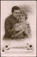 La Marguerite This postcard is pink with a sepia photo of a soldier and a woman holding daisies. Text at bottom center: "La Marguerite"; "La Marguerite, ami, ne peut plus rien m'apprendre / Je sais que vous m'aimez d'un cœur fidèle et tendre". On reverse: "Imprimé en France".