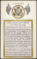 The American Creed This postcard has "The American Creed," written by William Tyler Page and accepted by the House of Representatives on April 3, 1918. Text at top center : "In God We Trust". On reverse: "I would never sacrifice my right to say,/I am a loyal citizen of the U.S.A./My Country 'Tis of Thee I sing/Sweet Land of Liberty."; "Educational Series: 'Americanism'/Published by The Albertype Co. Founded 1887 Brooklyn, N.Y."; "The Finest American Made View Post Cards-The Albertype Co., Brooklyn, N.Y."