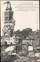 Guerre 1914-1918 This postcard is a black and white photo of the ruins of the Notre Dame Basilica. Text at top right: "Guerre 1914-1918/267 -- La Basilique de Notre-Dame de Brebières/Vue prise de la rue Jeanne d'Harcourt/après le bombardement du 29 Septembre 1914/The Basilica of N.-D. de Brebières/after several bombardment -- Sept. 1914." Text alongside left edge: "Visé Paris no 228". Text alongside right edge: "G. Lelong, 21, Rue St-Martin, Amiens". On reverse: "Imp. Catala Frères, Paris."