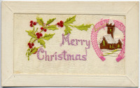 Merry Christmas This postcard has holly, a log cabin and "Merry Christmas" embroidered on the front. On reverse: "Embroidery"; "PH. and A."