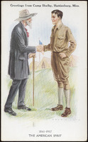 The American Spirit This postcard has a color illustration of an elderly man shaking hands with a soldier. Artist's name, Archie Gunn, is at lower right. Text at top center: "Greetings from Camp Shelby, Hattiesburg, Miss." Text at bottom center: "1861-1917 The American Spirit". On reverse: "© Illustrated Postal Card & Nov. Co. N.Y."; "Printed in the U.S.A."