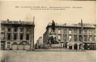 La Grande Guerre 1914-18 This postcard is a black and white photo of a statue outside Place Royale of Louis XV. Text at top center: "1406.--La Grande Guerre 1914-18 -- Bombardement de REIMS - Place Royale,/(La Statue de Louis XV est toujours debout." On reverse: "Phototypie Paris Baudinière".