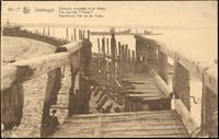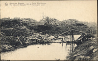 Ruines de Dixmude This postcard is a black and white photo of a canal with ruins on both banks. There are also broken wooden beams in the water. Text at top left: "Ruines de Dixmude 1914-18 Canal d'Handzaeme."; "The ruins at Dixmude Handzaeme canal." On reverse: "Ern. Thill, Bruxelles." -