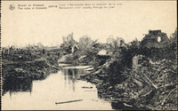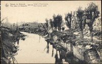 Ruines de Dixmude This postcard is a black and white photo of a canal with ruins on both banks. Text at top left: "Ruines de Dixmude 1914-18 Canal d'Handzaeme."; "The ruins at Dixmude Handzaeme canal." On reverse: "Ern. Thill, Bruxelles." -