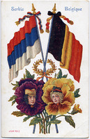 Serbie Belgique This postcard depicts two flags and two flowers underneath them, each flower having a human face in the center. Text at top left: "Serbie". Text at top right: "Belgique". Text at bottom left: "Juan Ruiz". On reverse: "Fantaisies trichromes"; "Paris -- Série no 85"; "Les Drapeaux du droit, par Juan Ruiz."; "Visé Paris. -- 455"; "Fabrication française". -
