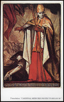 Cardinal Mercier Protects Belgium This postcard has a color drawing of a cardinal standing with his arm outstretched over a man. Text at bottom of picture: "Le Cardinal Mercier Protege La Belgique". Text at bottom right: "Translation: 'Cardinal Mercier Protects Belgium'". On reverse: "Dalkeith Poster Card P115"; "Artist: Dominique C. Fouqueray, France, 1916." -