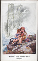 Refugees This postcard is a color illustration of two small children huddled together on a rocky bank. In the background is a large cathedral. Text at bottom center: "Refugees. (Who wouldn't help?) Réfugiés!" On reverse: "Inter-Art Co., Red Lion Square, London, W.C. 'Two-o-nine' Series. No. 211. British Manufacture." -
