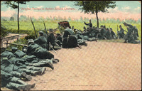 Belgian Troops in Action Round Louvain. This postcard is a color-tinted picture of soldiers lying on the dirt and crouching in the grass. Text at top left: "Belgian Troops in Action Round Louvain." Text at bottom: "© by the International News Service, N.Y." On reverse: "Belgian Troops in Action 'round Louvain. Belgian infantry taking cover from the German rifle fire during the defense of Louvain."; "W.C.A. 145"; "Made in U.S.A.", "New York", "London". -