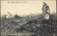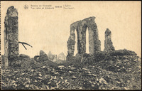 Ruines de Dixmude This postcard is a black and white photo of the ruins of a church. Text at top left: "Ruines de Dixmude 1914-18 L'Eglise."; "The ruins at Dixmude The church." On reverse: "Ern. Thill, Bruxelles." -
